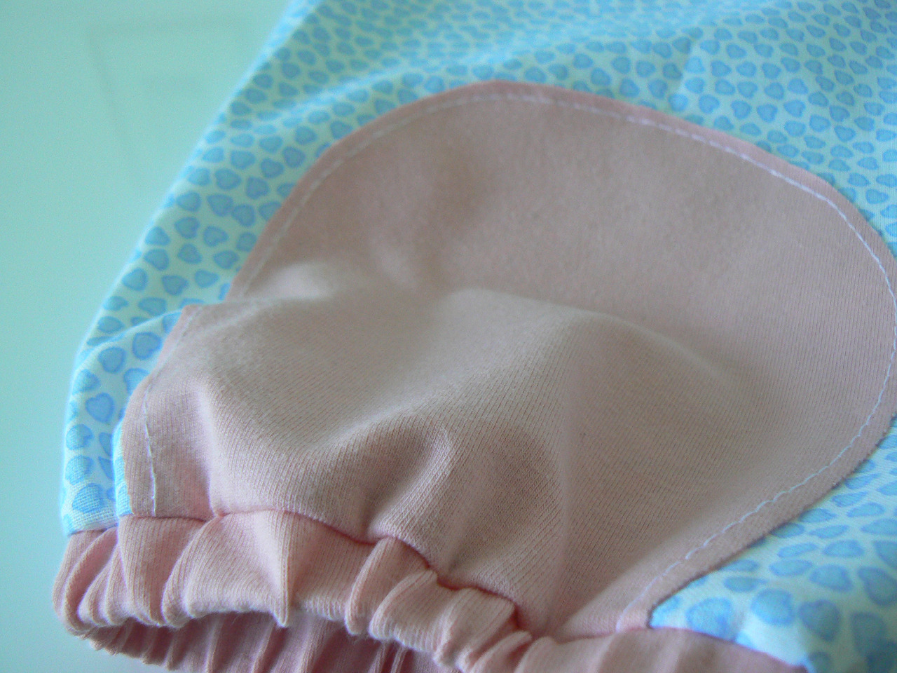 Nohavice s modrými srdiečkami na bielom podklade s ružovými záplatami na spodnej časti nohavíc. Nohavice odporúčam kombinovať so súpravou čiapočky, nákrčníka a čelenky z našej ponuky.